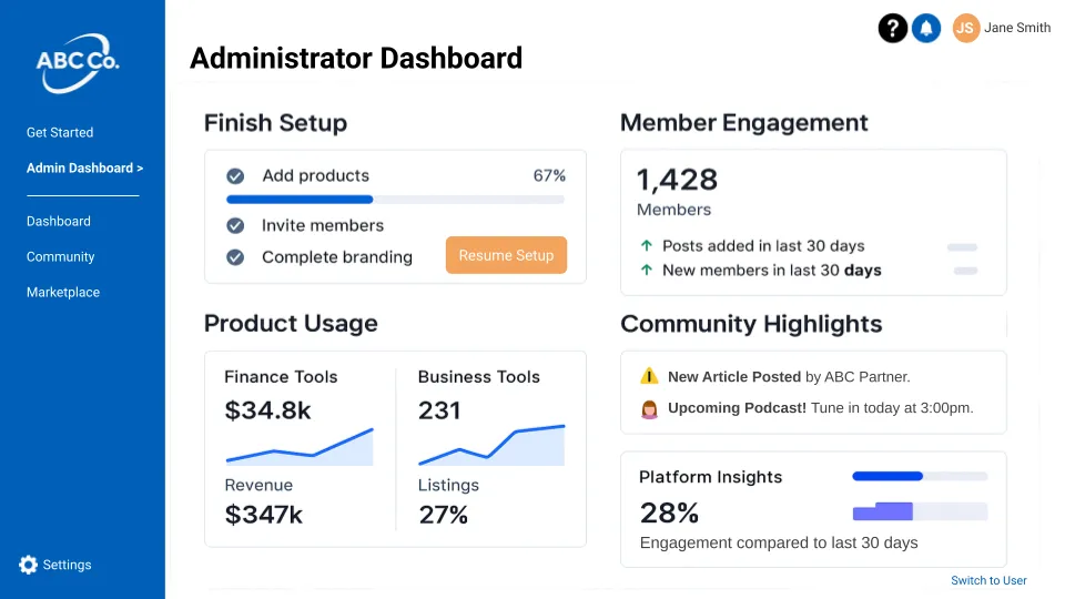 • Track usage of marketplace, community, and finance tools.